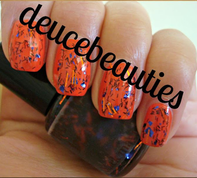 First up, Black Magic. This consists of a clear base and is packed with black string glitter, metallic orange bar glitter, and metallic purple shreds. The black string glitter sorta reminds me of spider legs which makes this a perfect topper for Halloween! This was my favorite from the collection and applied nicely in one generous coat.