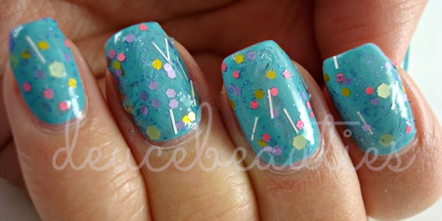 Jubilee is a sheer, lavender base packed with multi-colored glitters ranging from various shapes and sizes. I'm really loving the combination of colors in this polish and is very much appropriate for Spring! This required three coats for opacity.
